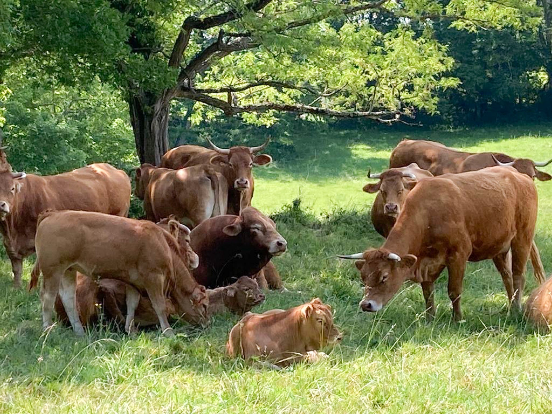 Le troupeau du Château d’Orignac, de race limousine, élevé en Agriculture Biologique, est constitué d’un taureau et d’une quinzaine de vaches. Elles sont nées et élevées sur le domaine dans un cadre privilégié de 30 hectares constitué de prairies bordées d’arbres. L’alimentation de nos bêtes est naturelle et repose sur un élevage nourri exclusivement à l’herbe sans engraissement, ni compléments alimentaires. Cette pratique qui vous semble être une évidence, constitue cependant de nos jours, une exception ! Elle nécessite de grands espaces et une faible densité de bêtes à l’hectare mais elle confère à la viande des qualités gustatives et nutritionnelles uniques avec un impact positif sur l’environnement.